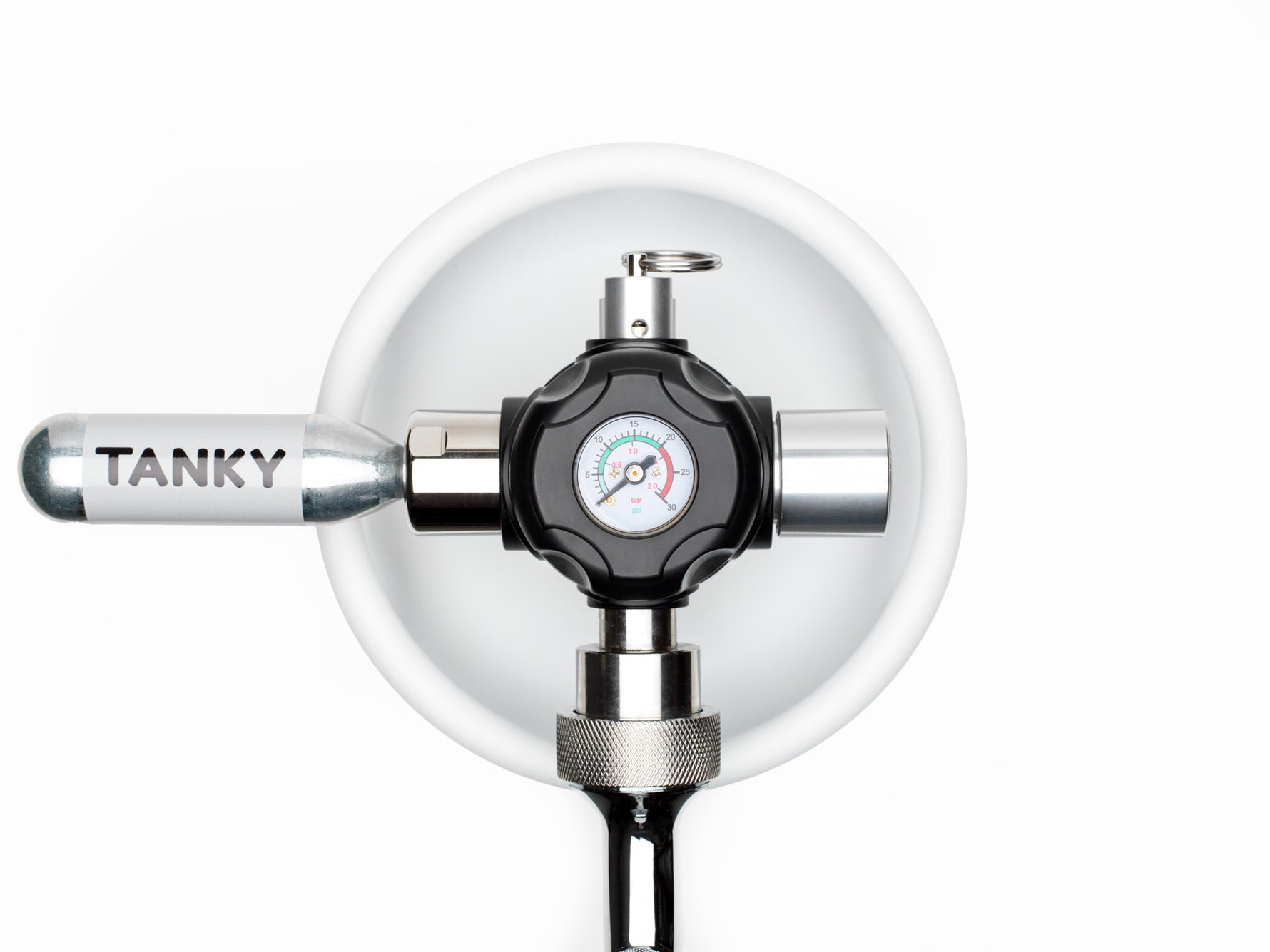 Fill with up to 2L of your drink, attach the tap + pressure lid, twist in a 16g threaded CO₂ cartridge, and pour.